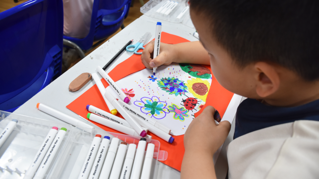 在创作环节,同学们学习了和平鸽的构图技巧和象征性色彩的运用。同学们不约而同地选择了各类蓬勃盛放的花朵作为主体背景,表达对和平的向往;有的同学在背景中加入一些小昆虫,使画面更丰富,更显生机勃勃;还有的同学创新地在画面中加入橄榄枝等和平符号。每一幅作品都凝聚着同学们对和平的独特理解,都承载着对抗战英雄的崇高敬意。