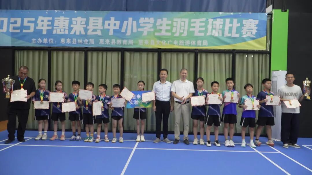 经过两天紧张激烈的角逐,10月2日下午,由县林业局、县教育局、县文化广电旅游体育局联合举办的“激情全运心心相印,森林防火人人有责”、“‘羽’林争霸,护林有我”2025年惠来县中小学生羽毛球比赛在育星豪庭球馆圆满落下帷幕,并举行颁奖仪式。县林业局副局长谢木春、县教育局副局长方东升、县文化广电旅游体育局三级主任科员洪少龙等参加颁奖仪式。