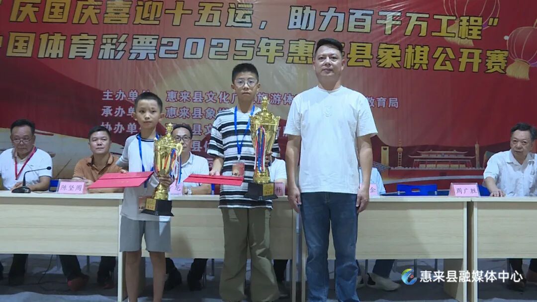 10月3日下午,由县文化广电旅游体育局、县教育局主办,县象棋协会承办的“庆国庆喜迎十五运,助力‘百千万工程’”2025年惠来县象棋公开赛在惠来慈云实验中学圆满闭幕并举行颁奖仪式。县教育局副局长方东升、县文化广电旅游体育局三级主任科员洪少龙等参加颁奖仪式。